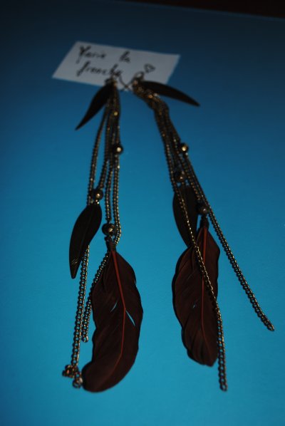 Paire de longues boucles d'oreilles avec une plume de chaque coté. Portée 3 ou 4 fois