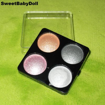 Palette 4 minis Fards. Couleurs : Blanc, Jaune pâle, Vert foncé, Rose pastel. J'ai légèrement utilisé le blanc