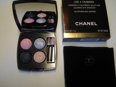 Palette "Les quatre ombres" Chanel, 95 Sparkling Satins Très peu utilisée, avec housse velours et boîte. Voir : http://www.leblogdelaura.com/2011/03/les-4-ombres-de-chanel.html