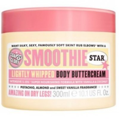 reste plus de la moitié Beurre corporel Smoothie Star de la marque anglaise Soap and Glory. Enrichi en huiles de pistache, d'amande, et de coco et en beurres de karitér et de cacao. Parfum : amande, pistache et vanille. Pot de 300ml